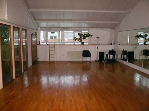 Raumgrösse 70 m², Raumhöhe ca. 4,00 m, Parkettfußboden, Schwingboden, Spiegelwand, Matten, Stühle, gute Musikanlage im Raum, Tageslicht.